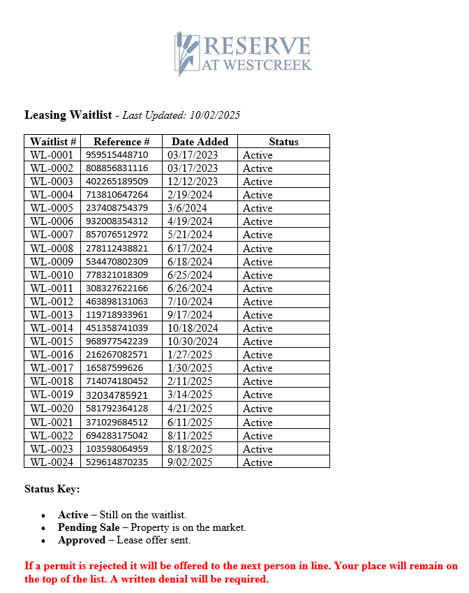A leasing permit is required to lease your home. All 100 permits are currently in use. To be added to the waitlist, please email reservewestcreek@gmail.com requesting to be added. A reference number will be provided to check your place in line.